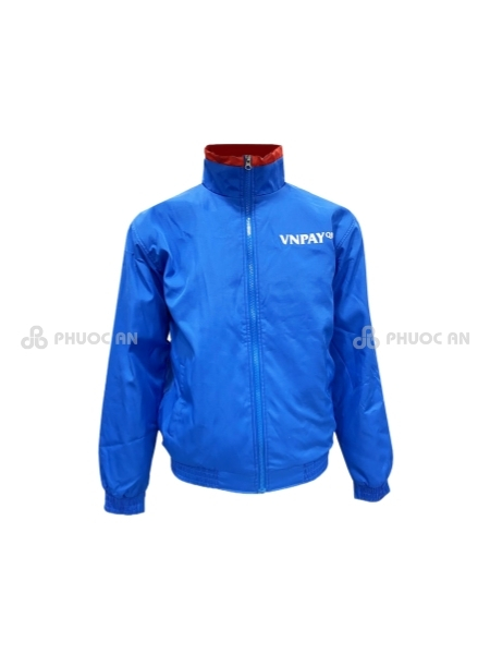 (Hình ảnh: Áo khoác xanh dương, vải Micro mềm mịn, nón giấu gọn, logo Sơn Orange My Color in sắc nét, form dáng năng động. Sản xuất bởi MAYPHUOCAN.)