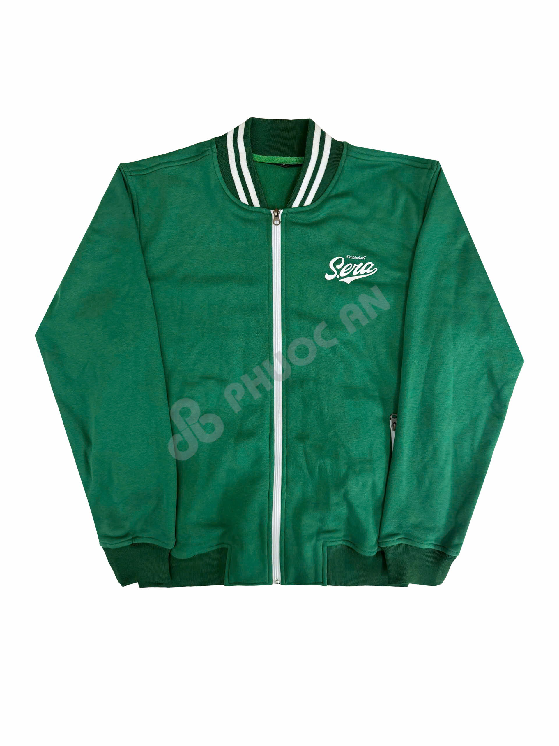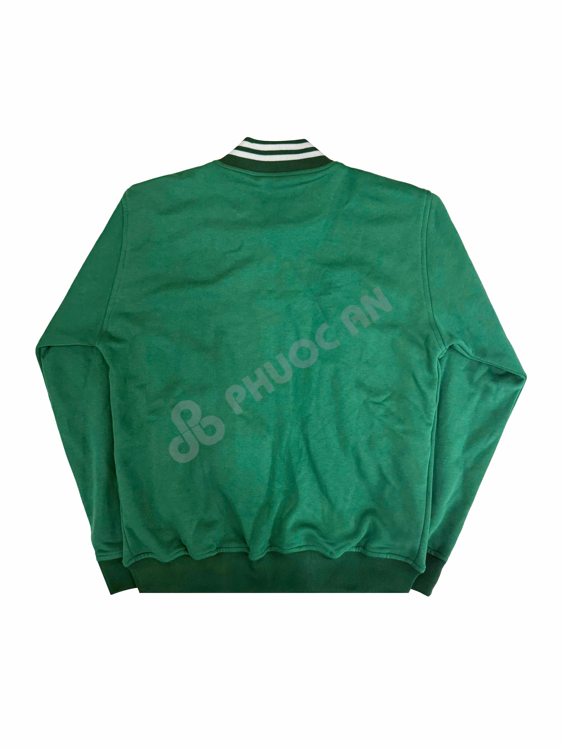 Mẫu áo khoác thể thao với form dáng bomber đầy cá tính và logo được in ấn sắc nét do May Phước An sản xuất. Đây là mẫu áo mà các doanh nghiệp cần đặt may áo khoác đồng phục cho nhân viên, phù hợp với các hoạt động team building, thể thao ngoài trời, vừa có thể chống nắng, vừa tạo nên phong cách rất riêng của doanh nghiệp bởi tông màu xanh lá cây đậm sang trọng, kết hợp cổ và viền trắng tinh tế.