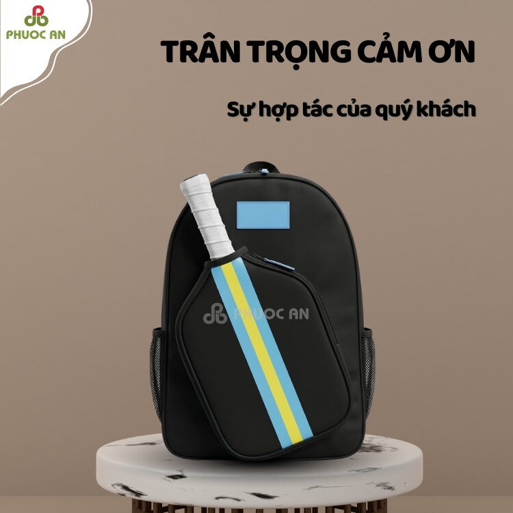 Balo thể thao pickleball màu đen do May Phước An sản xuất được thiết kế chuyên dụng cho các vận động viên, câu lạc bộ và doanh nghiệp tổ chức sự kiện thể thao. Màu đen mạnh mẽ kết hợp form dáng hiện đại giúp tôn lên phong cách năng động và chuyên nghiệp. Sản phẩm sử dụng vải dù cao cấp chống thấm, ngăn chứa rộng rãi, dễ dàng đựng vợt, bóng và đồ cá nhân. Logo thương hiệu hoặc câu lạc bộ có thể in, thêu hoặc ép nhiệt theo yêu cầu, tạo dấu ấn nhận diện riêng. May Phước An chuyên nhận may balo thể thao, balo quà tặng sự kiện với thiết kế linh hoạt, đảm bảo chất lượng, độ bền và thời gian giao hàng đúng hẹn cho đối tác doanh nghiệp trên toàn quốc.