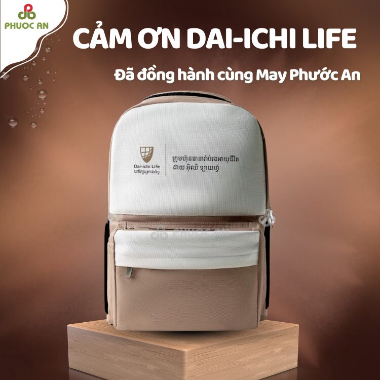 Trong ngành bảo hiểm nhân thọ, quà tặng không chỉ là vật phẩm đó là biểu tượng của sự đồng hành trọn đời. MAYPHUOCAN tự hào đồng hành cùng Công ty TNHH Bảo Hiểm Nhân Thọ Dai-ichi Việt Nam thương hiệu bảo hiểm Nhật Bản dẫn đầu thị trường với hơn 4 triệu khách hàng và 300.000 tư vấn viên. Balo Quà Tặng Thương Hiệu Dai-ichi Life được thiết kế dành riêng cho khách hàng VIP, đối tác chiến lược và tư vấn viên xuất sắc. Quy trình sản xuất tại xưởng may balo tuân thủ nghiêm ngặt tiêu chuẩn màu be trắng đặc trưng của Dai-ichi, đảm bảo từng chiếc đều đạt chuẩn thương hiệu toàn cầu.