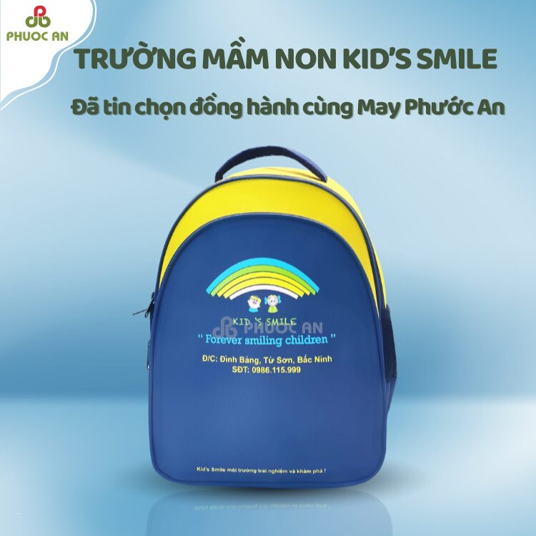 Balo học sinh Kid’s Smile được xưởng may balo sản xuất để đáp ứng nhu cầu của học sinh mầm non trường Kid’s Smile, mang đến thiết kế thẩm mỹ, bắt mắt, phù hợp với lứa tuổi của các em nhỏ cùng sự thoải mái, êm ái giúp các em dễ chịu khi đeo đi học.