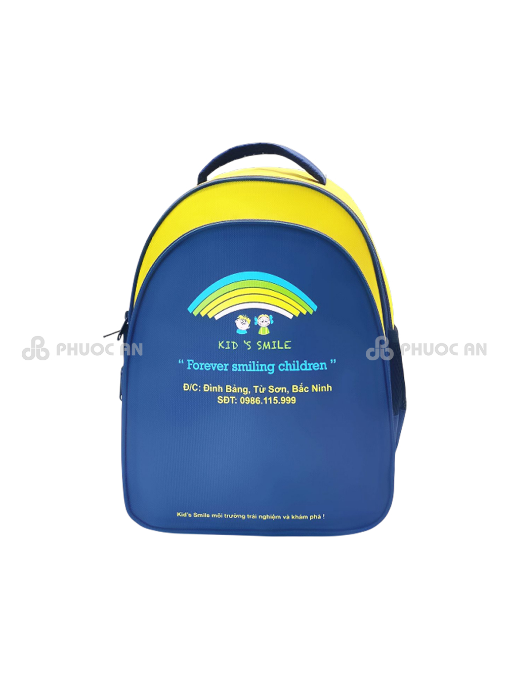 Balo học sinh Kid’s Smile với màu vàng – xanh đen trẻ trung là người bạn đồng hành lý tưởng cho học sinh mầm non. May Phước An không chỉ là đơn vị sản xuất mà còn là đối tác đồng hành cùng bạn trong hành trình khẳng định thương hiệu và mang đến chất lượng tốt nhất cho người dùng. Bạn cần thêm thông tin hoặc muốn đặt hàng ngay? Liên hệ ngay hotline 0939 91 06 86 để được tư vấn và báo giá nhanh chóng cùng chiết khấu cực cạnh tranh cho đơn hàng số lượng lớn.