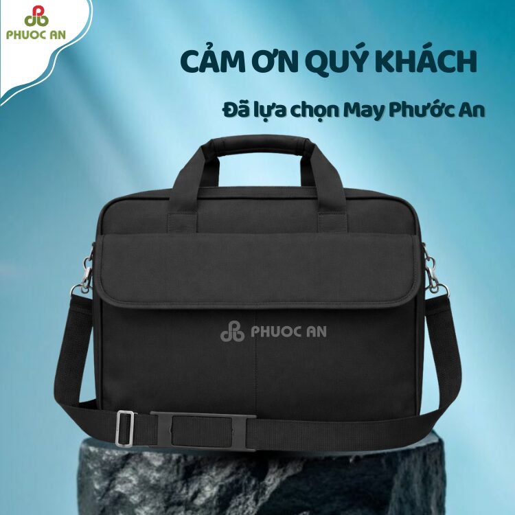 Sản phẩm được làm từ vải cao cấp chống thấm, bền chắc, bảo vệ laptop và hồ sơ, đồng thời ngăn chính rộng rãi, ngăn phụ tiện ích giúp sắp xếp đồ dùng gọn gàng. Logo hoặc thương hiệu có thể in hoặc thêu theo yêu cầu, tạo điểm nhấn chuyên nghiệp và nâng tầm thương hiệu.