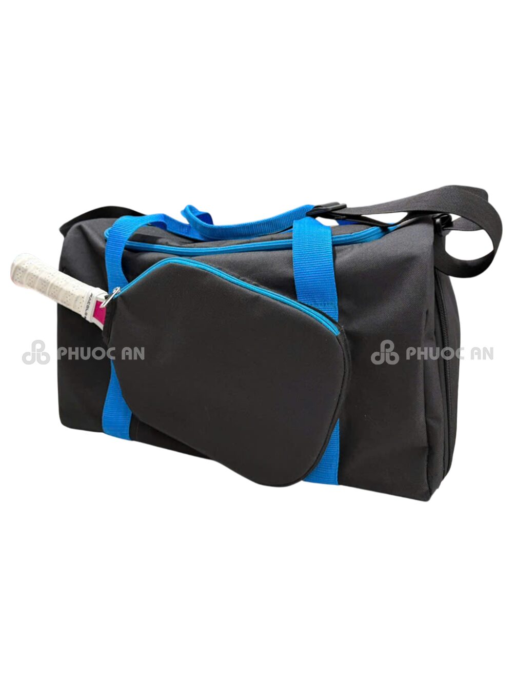 Túi xách thể thao màu đen phối viền xanh mang phong cách mạnh mẽ, hiện đại và phù hợp cho các doanh nghiệp hoặc tổ chức hướng đến hình ảnh chuyên nghiệp. May Phước An cung cấp dịch vụ thiết kế – sản xuất túi thể thao theo yêu cầu, cho phép khách hàng tùy chỉnh phối màu, kiểu dáng và in logo thương hiệu rõ nét. Mẫu túi màu đen phối viền xanh vừa đảm bảo sự tinh tế, vừa tạo điểm nhấn nổi bật cho đội ngũ hoặc sự kiện thể thao. Sản phẩm được may từ chất liệu cao cấp, bền chắc, có khả năng chống thấm và chịu lực tốt. Là xưởng may quy mô lớn, May Phước An không bán lẻ mà chuyên phục vụ đơn hàng số lượng lớn cho doanh nghiệp, trường học, chương trình quảng bá thương hiệu hoặc quà tặng sự kiện.